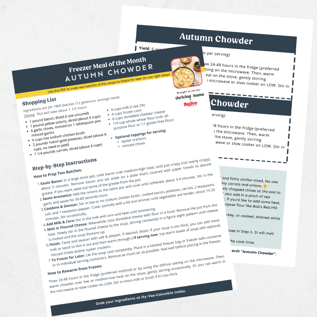 This printable guide includes shopping list, instructions, and freezer labels and will be sent directly to your inbox (check junk folder!).